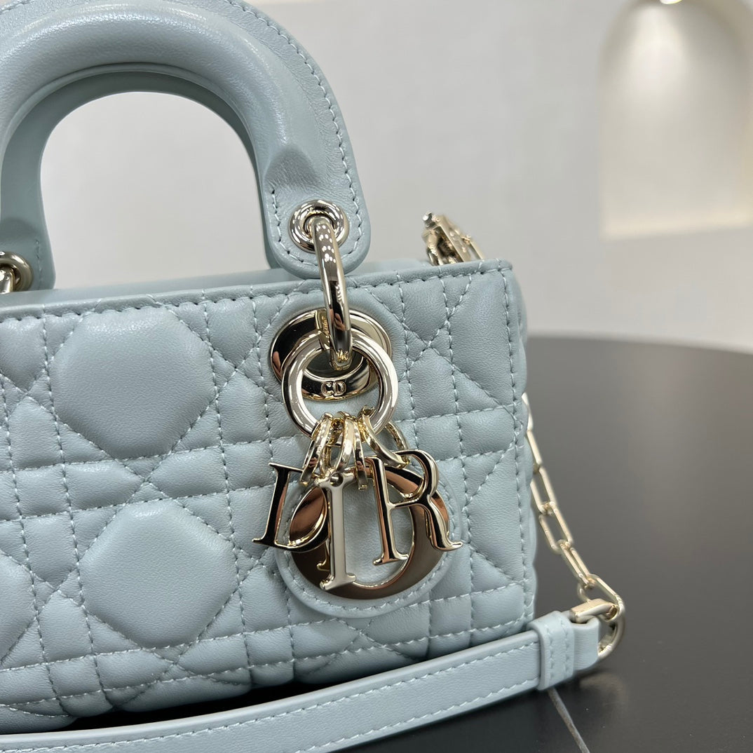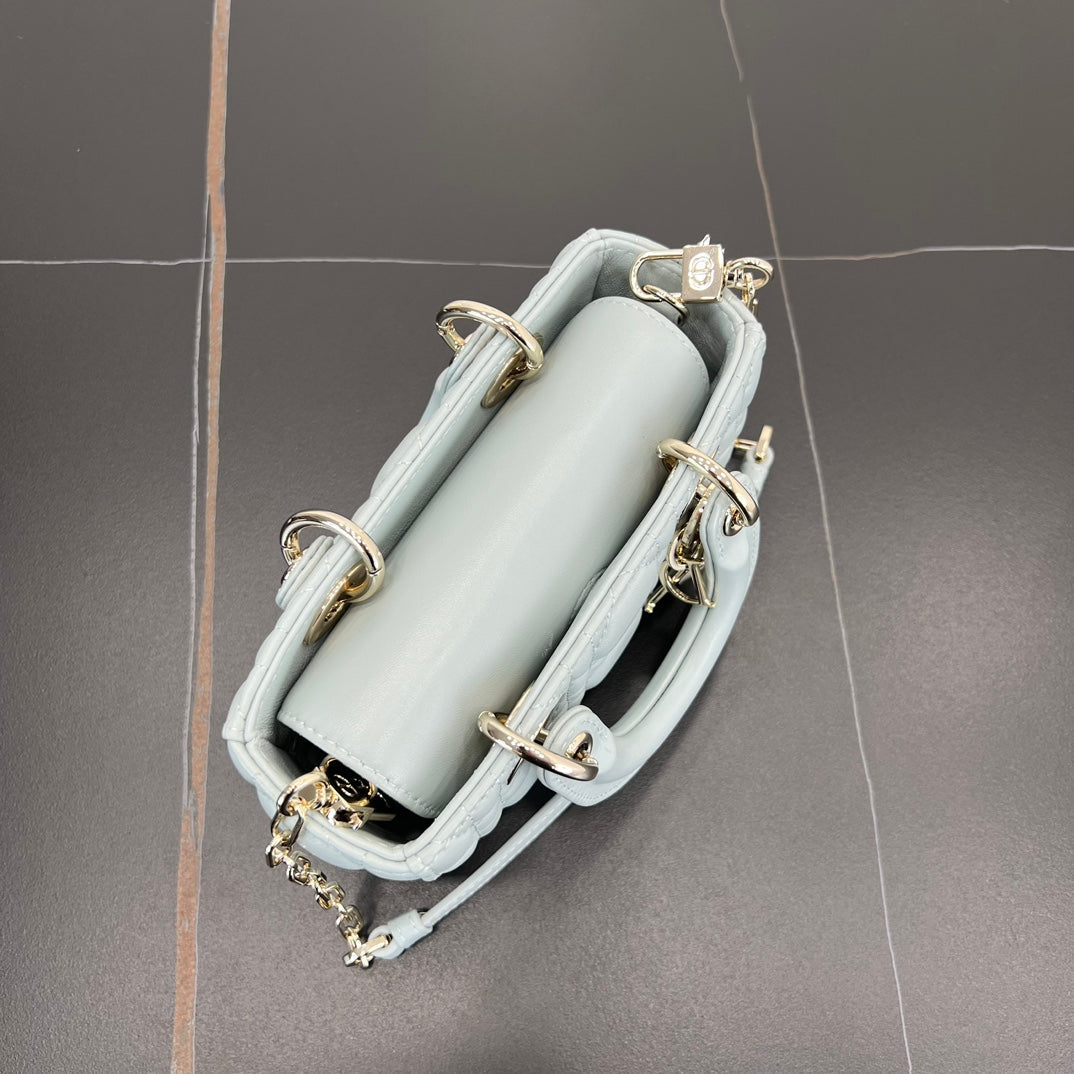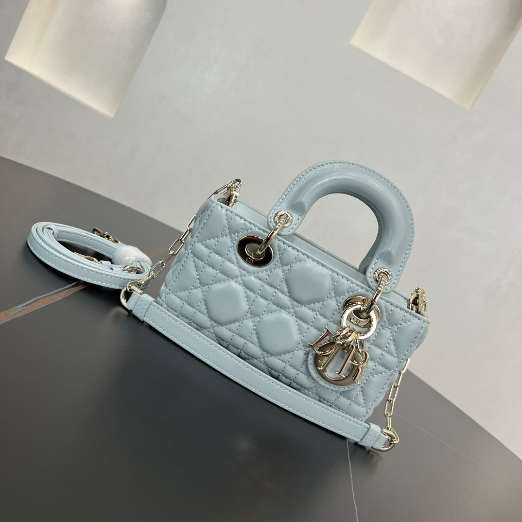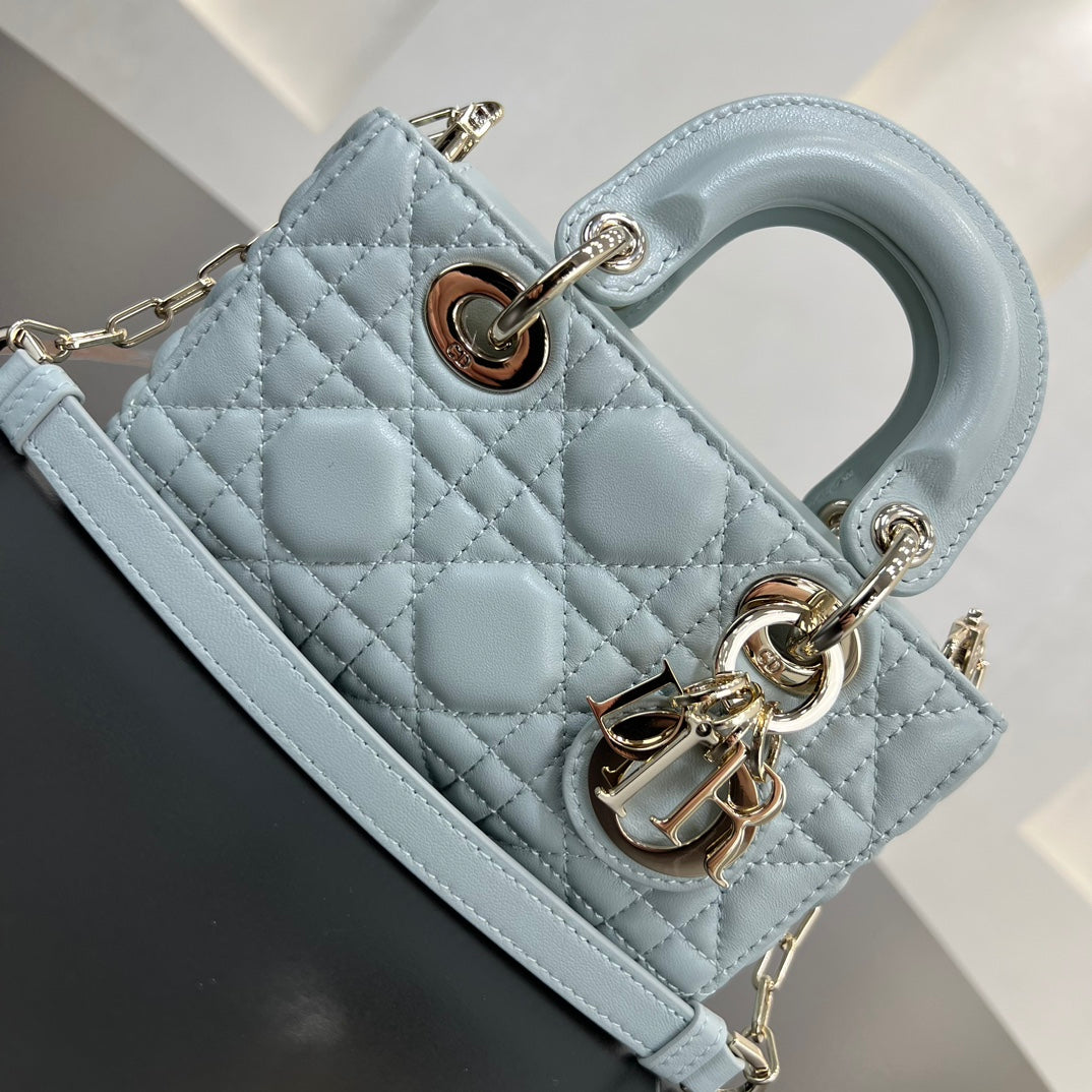 Experience luxury and sophistication with the Daifei Mini Handbag. Crafted from milky white sheepskin and adorned with a rattan grid pattern, this handbag exudes elegance. The light gold D.I.O.R. pendants elevate the minimalist design, while the detachable chain shoulder strap and adjustable features provide versatility. Stay stylish and organized with the microfiber lining. Search code: 278378 Size: 16 x 9 x 5cm Colors:Blue