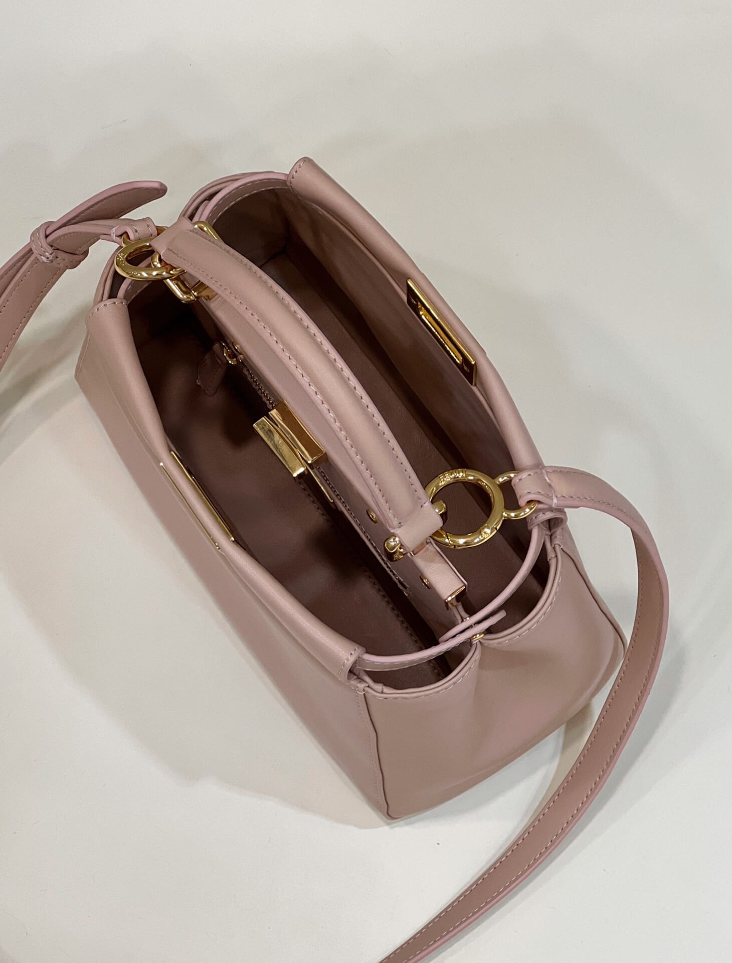 Features a powder pink canvas lining with an embroidered FF motif, two compartments separated by a stiff partition, an inner zip pocket and gold-finish metalware.