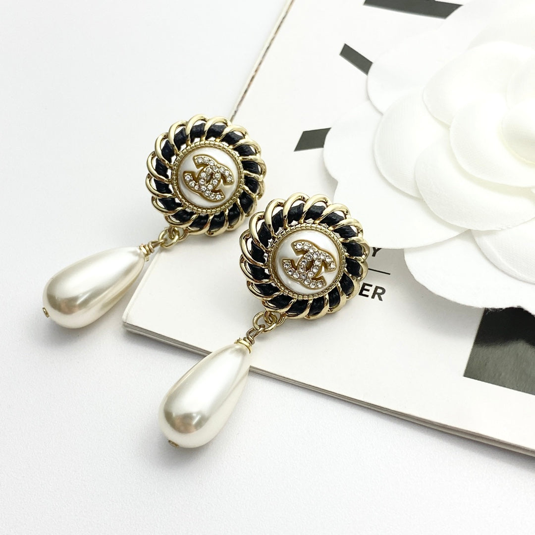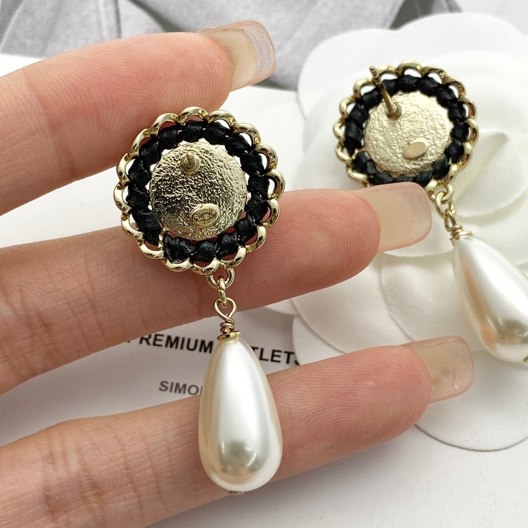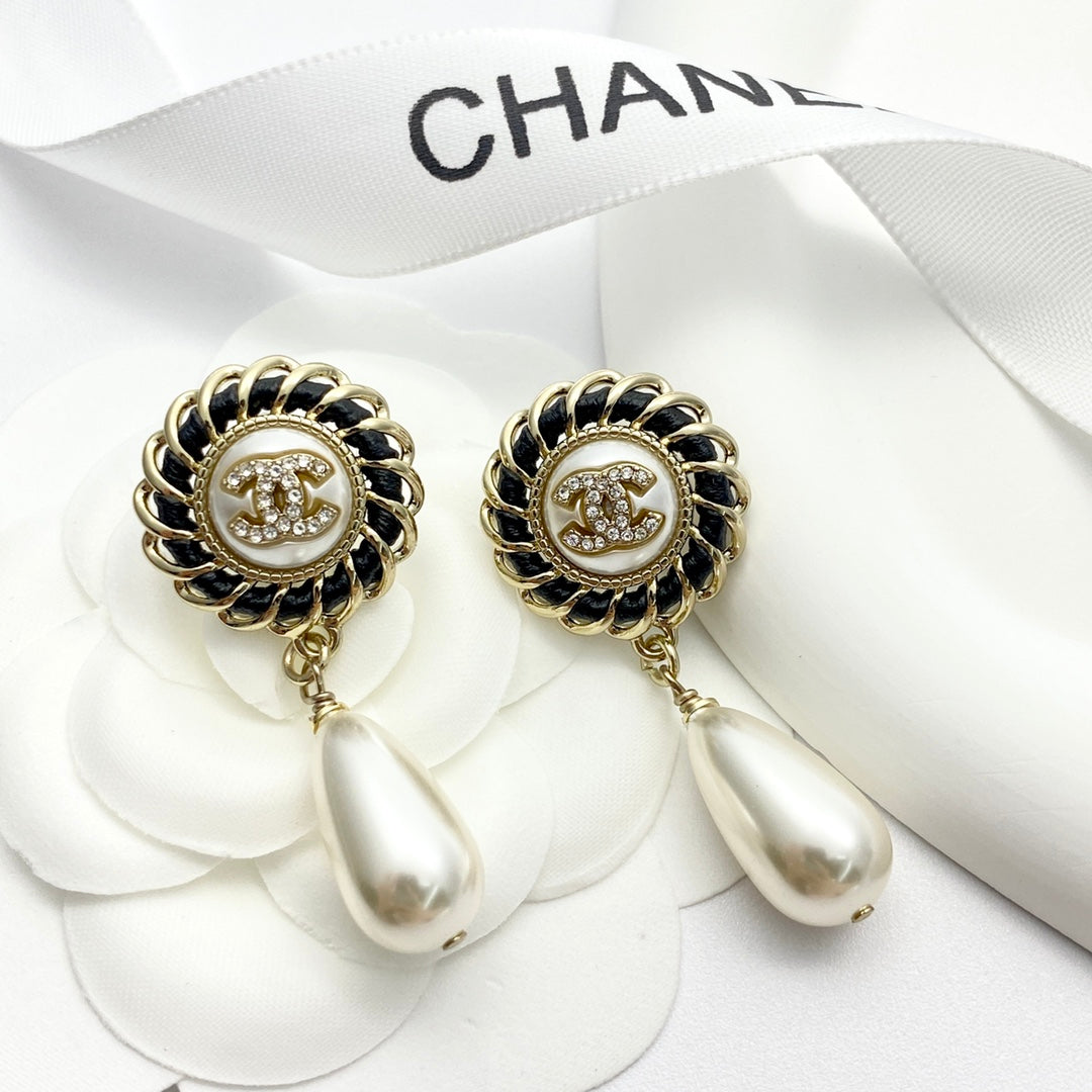 Introducing CHA's newest collection, the Waterdrop Round Pearl Black Leather Earrings. Featuring a vintage design with 24 round black pearls and a water drop pearl, these earrings are elevated with Chanel's iconic double C letters and a luxurious leather design. Exude elegance and sophistication with these classic and timeless earrings.