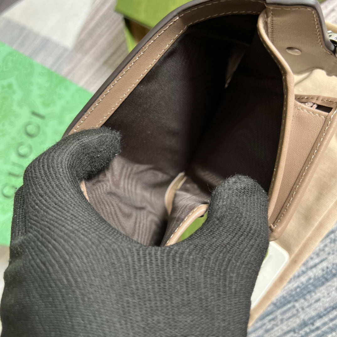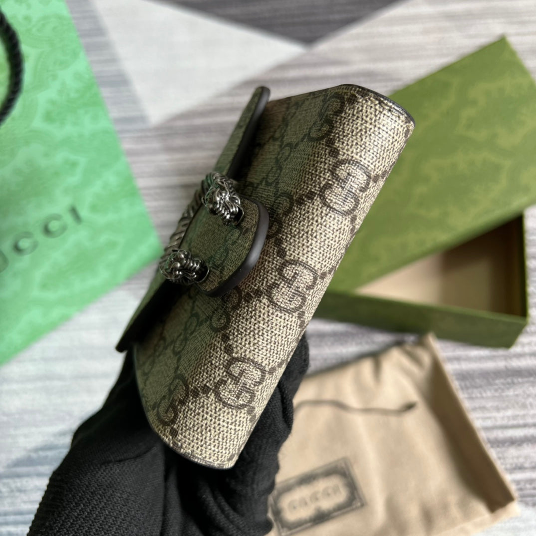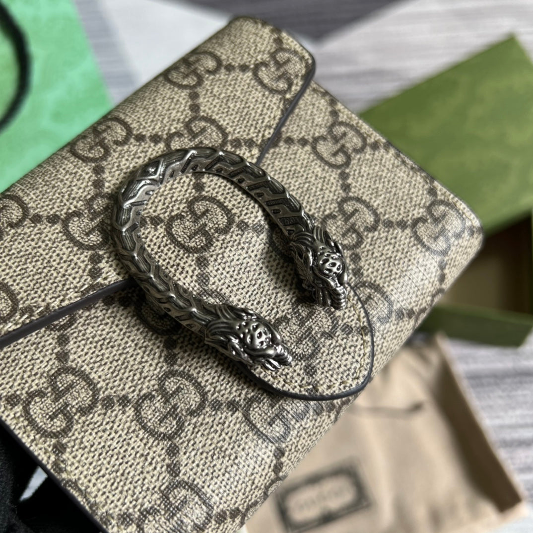 Discover the vintage charm of the Dionysus Canvas Square Mini Handbag. Featuring a super double G pattern and a super mini size, this handbag exudes style and quality. The khaki and ebony color adds a retro touch while the oversized logo pattern speaks of the brand's love for the past. Complete with counter green packaging, this handbag is a timeless accessory. Brown leather piping. Model: 627073. Dimensions: 11x 9.5x 3cm. Color: khaki/PVC.
