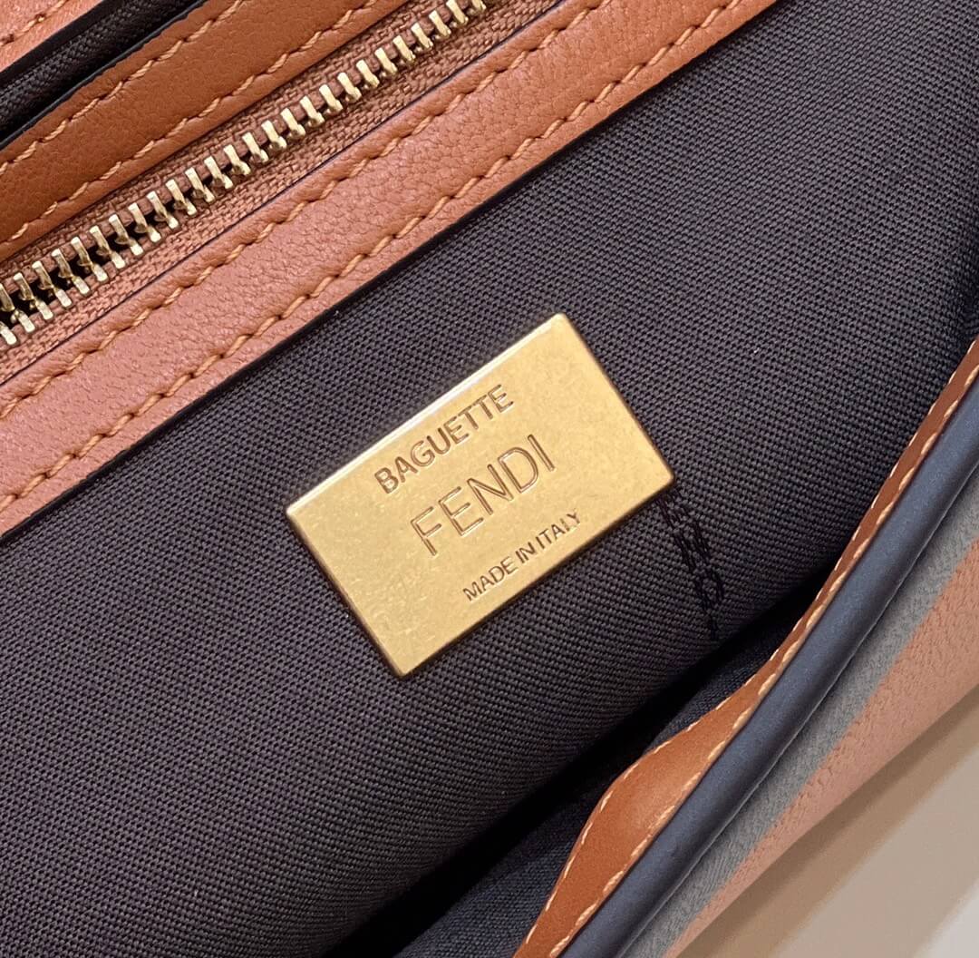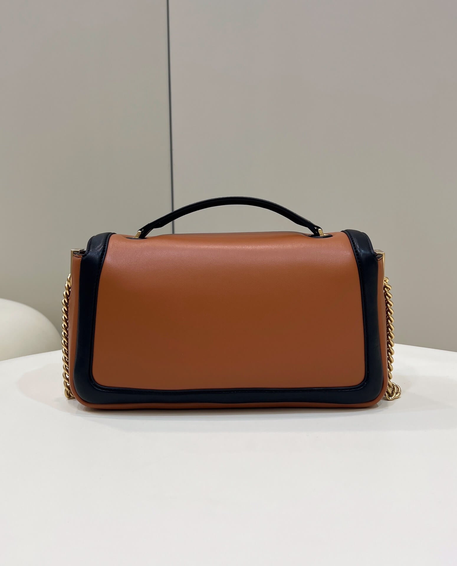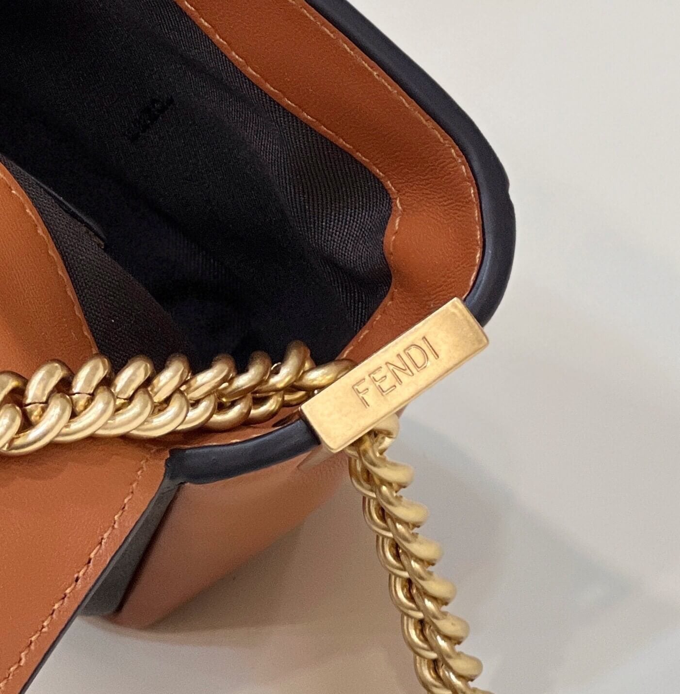fd look baguette chain bag plain pattern leather black with brown 70220