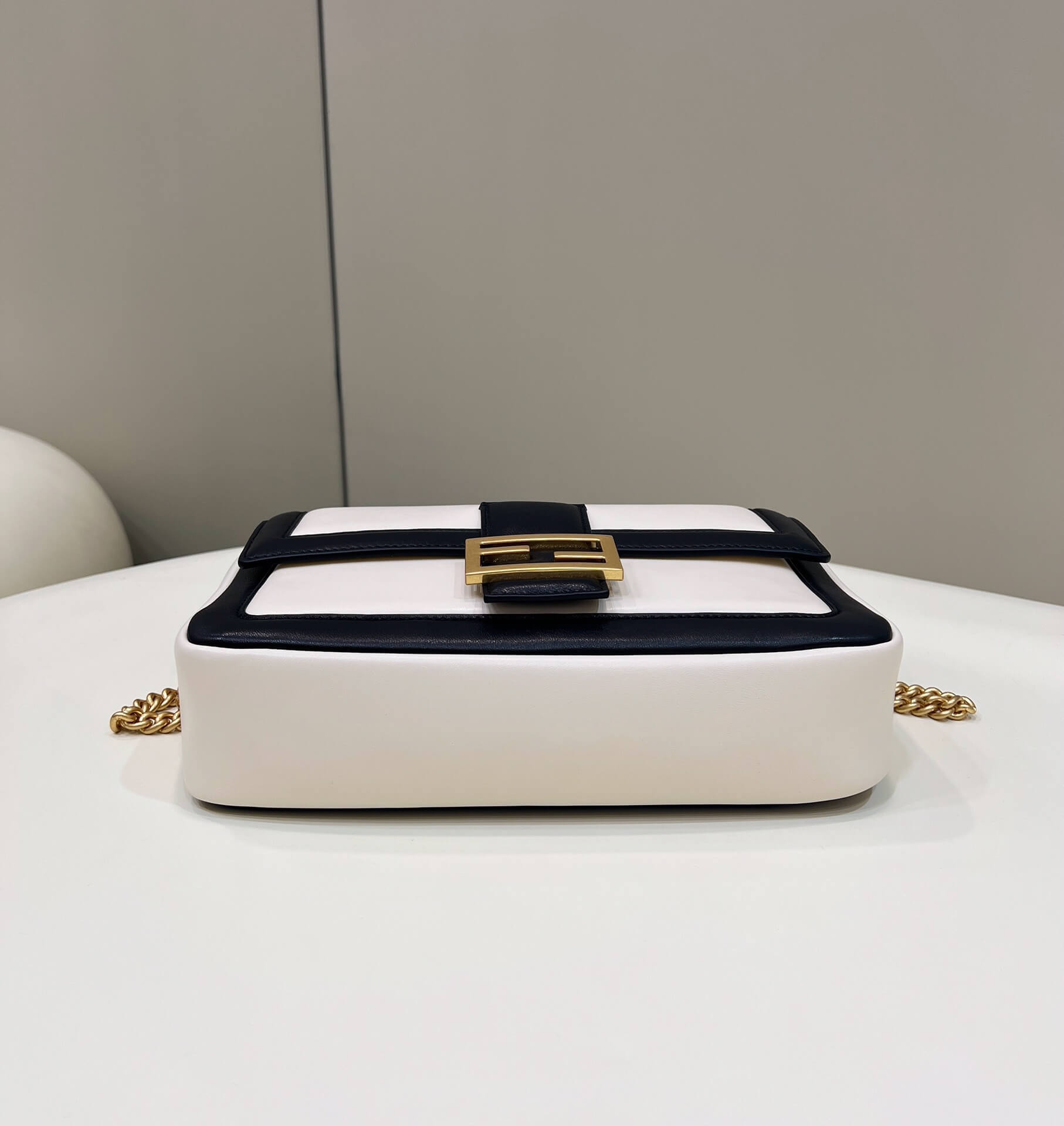 fd look baguette chain bag plain pattern leather black with white 70220