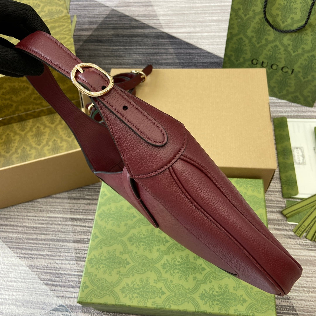 The 2024 Fall/Winter collection reimagines the Gucci Jackie 1961 shoulder bag, crafted from refined Rosso Ancora leather and featuring a new light gold-toned push-lock closure. This design highlights the brand's classic handbag craftsmanship, crescent shape, and fluid silhouette. The small-sized shoulder bag comes with a leather strap and an additional red-and-green woven strap, offering versatile styling options