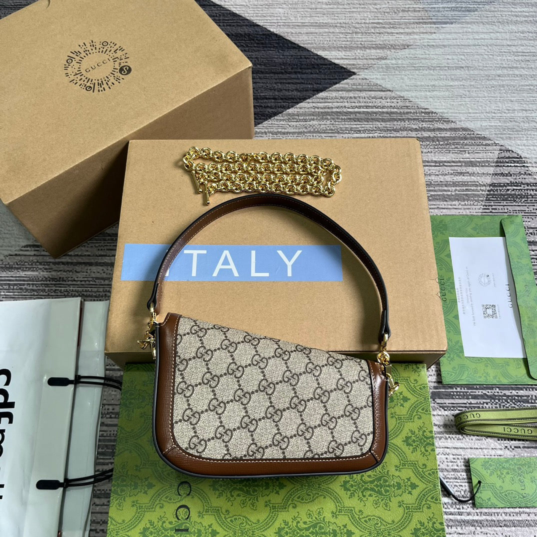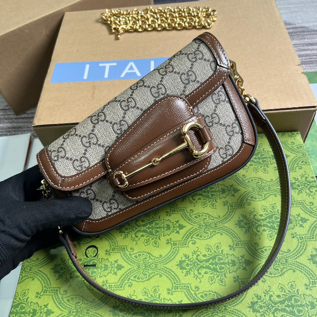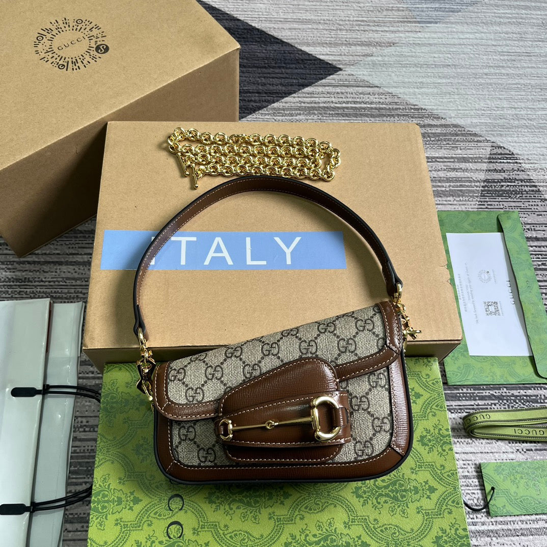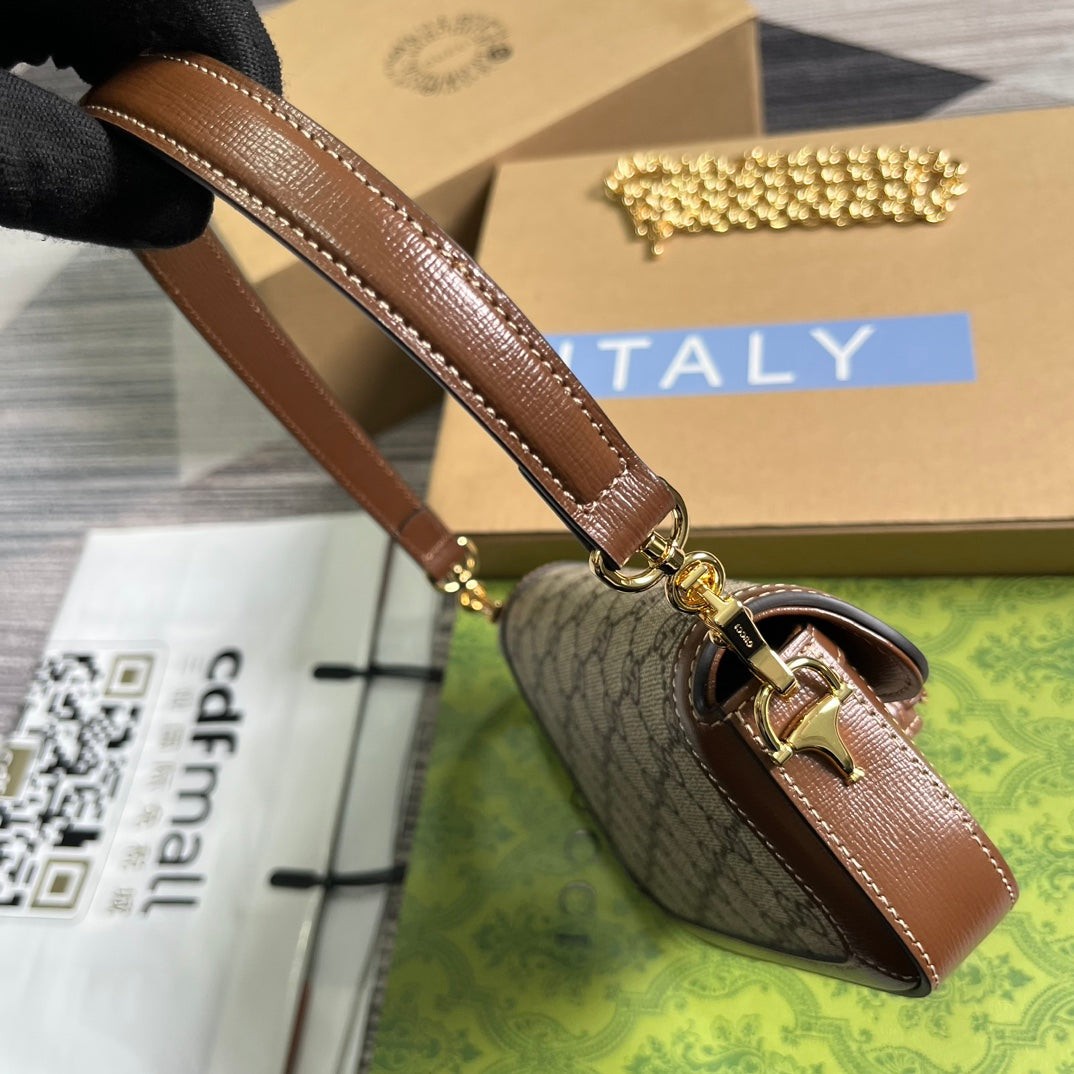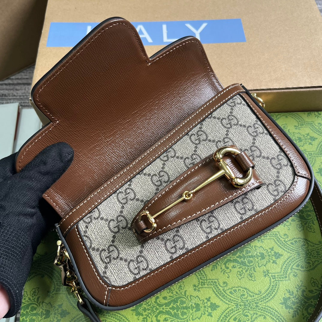 Discover the sleek and modern style of the Gucci Horsebit 1955 series mini shoulder backpack. With a fashionable asymmetrical design, this leather handbag pays tribute to the brand's iconic horseneck buckle style accessory. Made with premium materials and full packaging, your everyday essentials will stay organized and secure. Model: 774209. Size: 8-12.5 (length) x 19.5 (width) x 3-6cm (thickness) Color: Brown