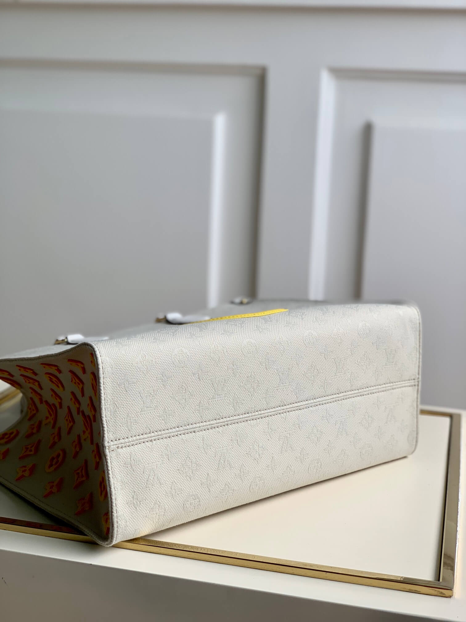 Big size:41 x 34 x 19cm COLOR:yellow?white MATERIAL:CANVAS WITH LEATHER TRIM