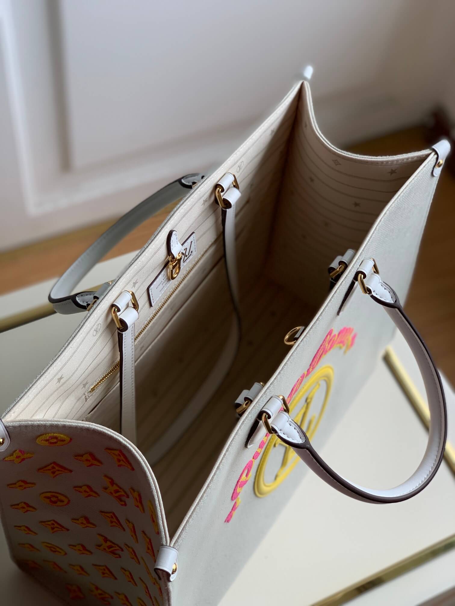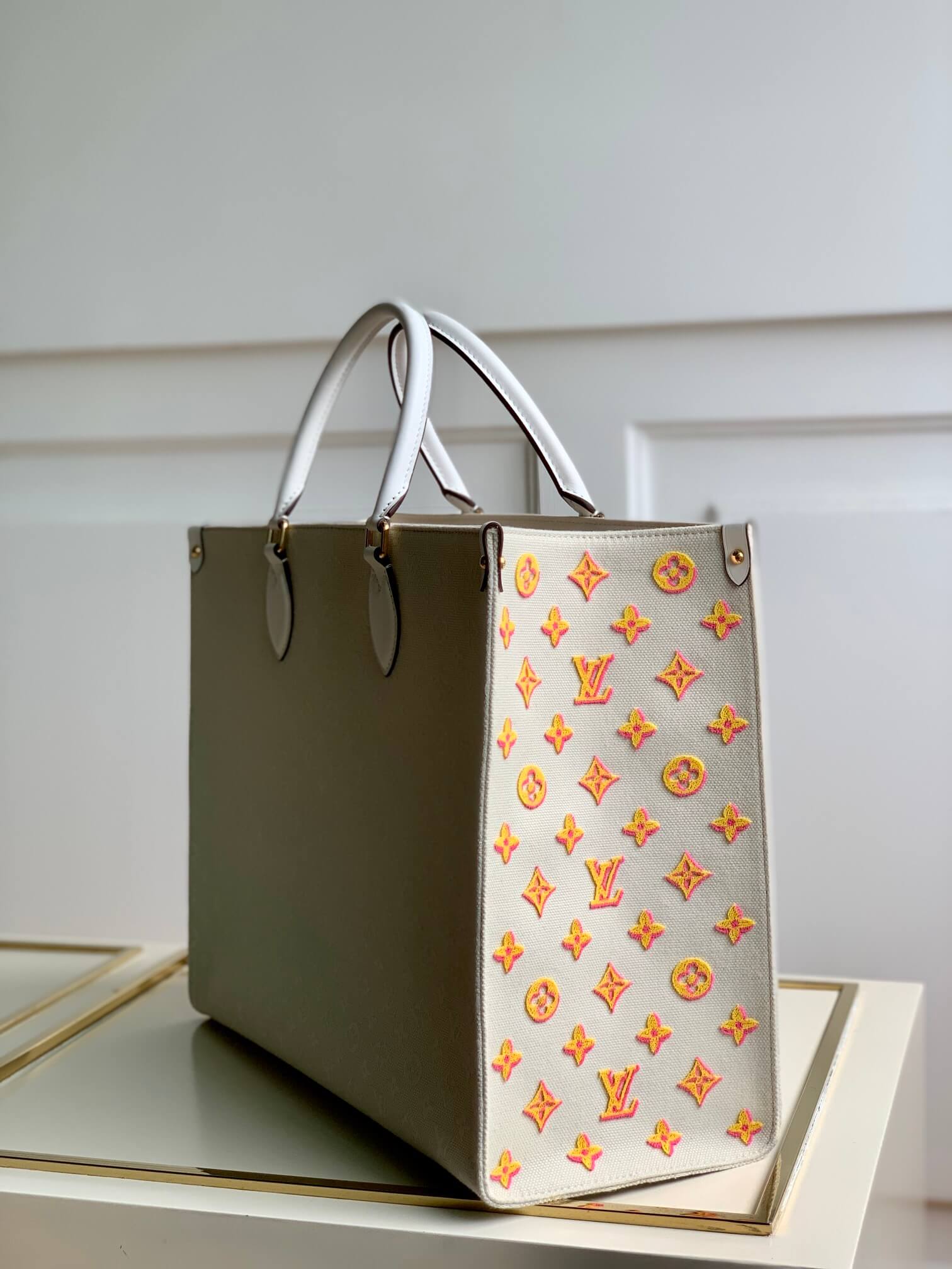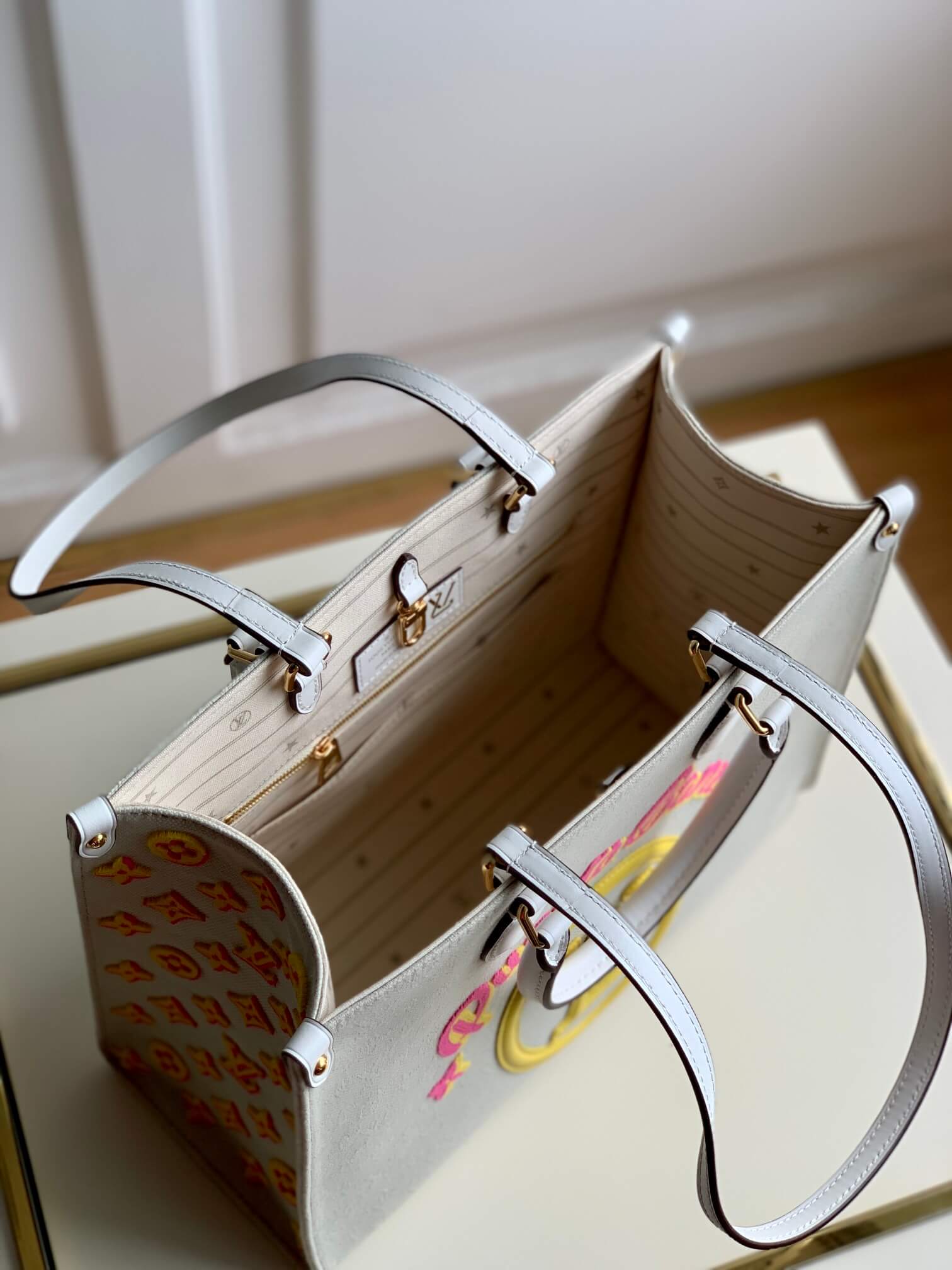 m20815 onthego tote bag embroidered and leather trim small 35 yellow green