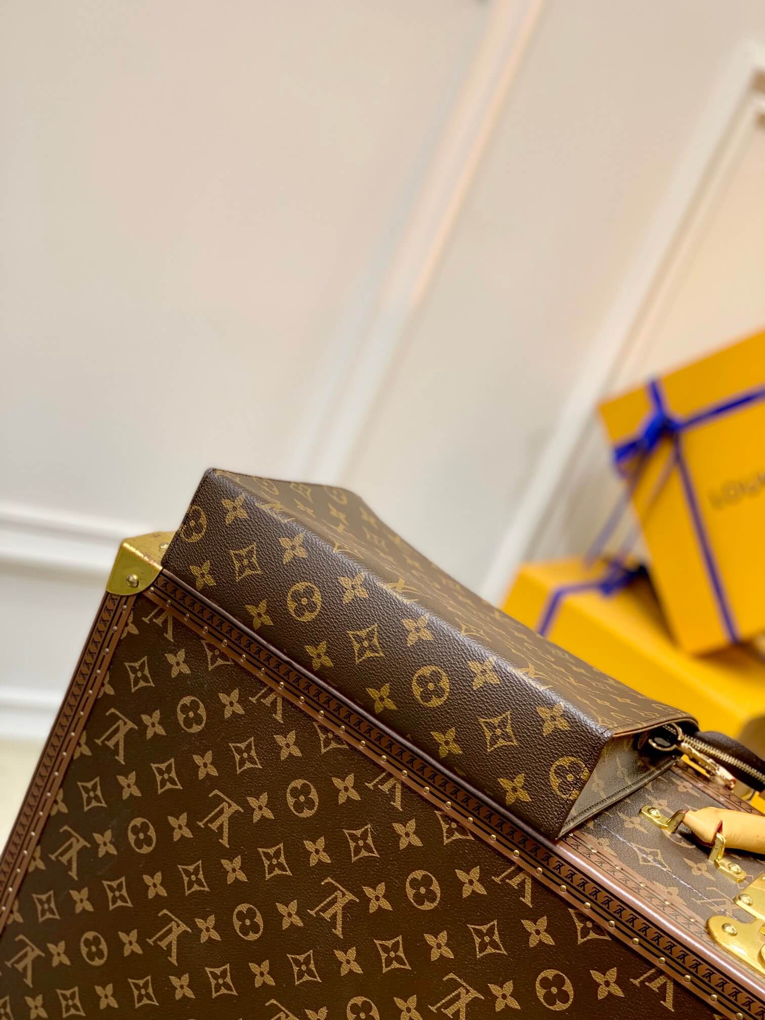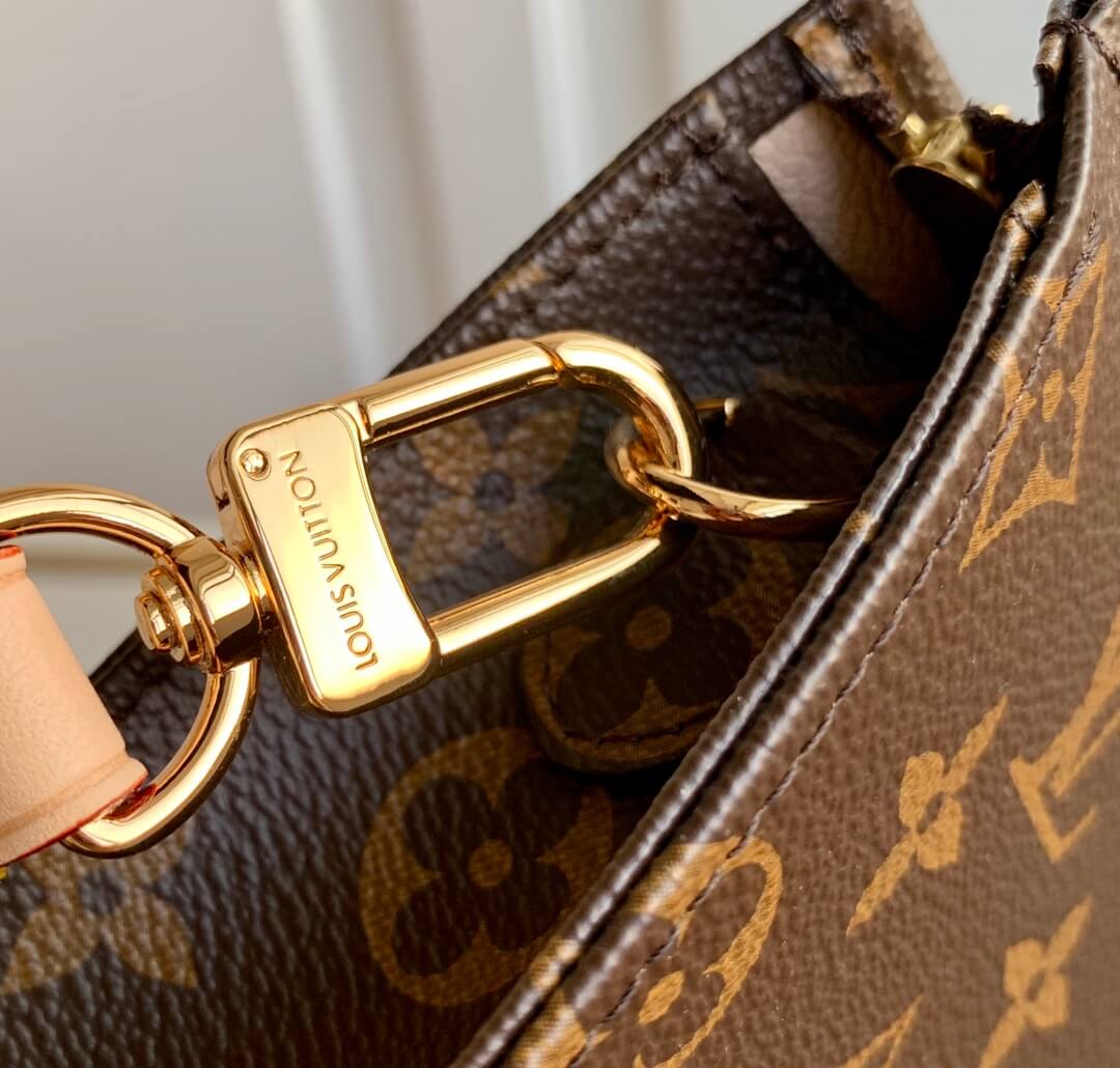 ? Monogram canvas ?Golden brass zip closure with leather tab ?Washable lining, gusset sides