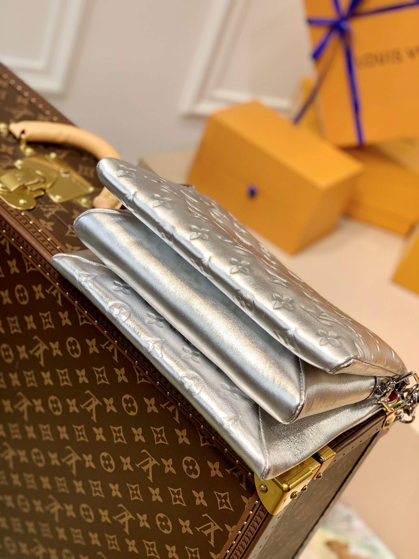 The coussin small handbag was a big hit at the spring and summer 2021 fashion show. Monogram embossed fluffy sheepskin creates a pillow configuration, injecting avantgarde style into simple design. It can be used as a shoulder belt Crossbody or an avatar chain staff bag, and can also be carried under the armpit.