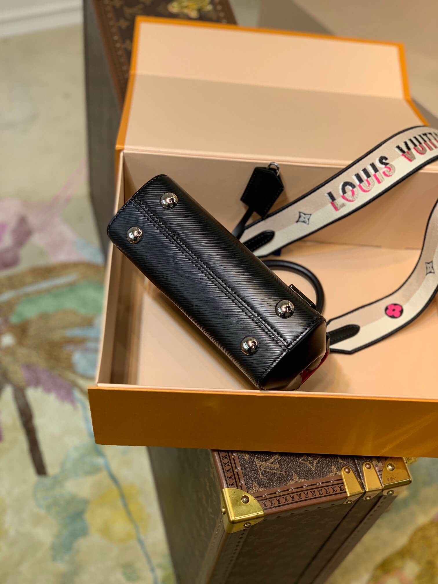 This exclusive Cluny Mini handbag features a reversible jacquard strap: one side displays the Louis Vuitton logo for a statement look; the other shows Monogram Flowers, for a subtle effect. Made from textured Epi leather, the bag also features an LV signature in smooth resin and a contrasting lining. The strap is removable for a more dressed-up allure.