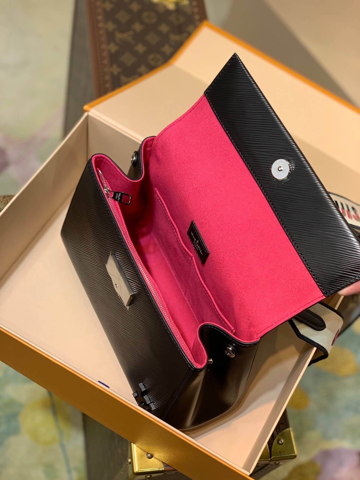 This exclusive Cluny Mini handbag features a reversible jacquard strap: one side displays the Louis Vuitton logo for a statement look; the other shows Monogram Flowers, for a subtle effect. Made from textured Epi leather, the bag also features an LV signature in smooth resin and a contrasting lining. The strap is removable for a more dressed-up allure.