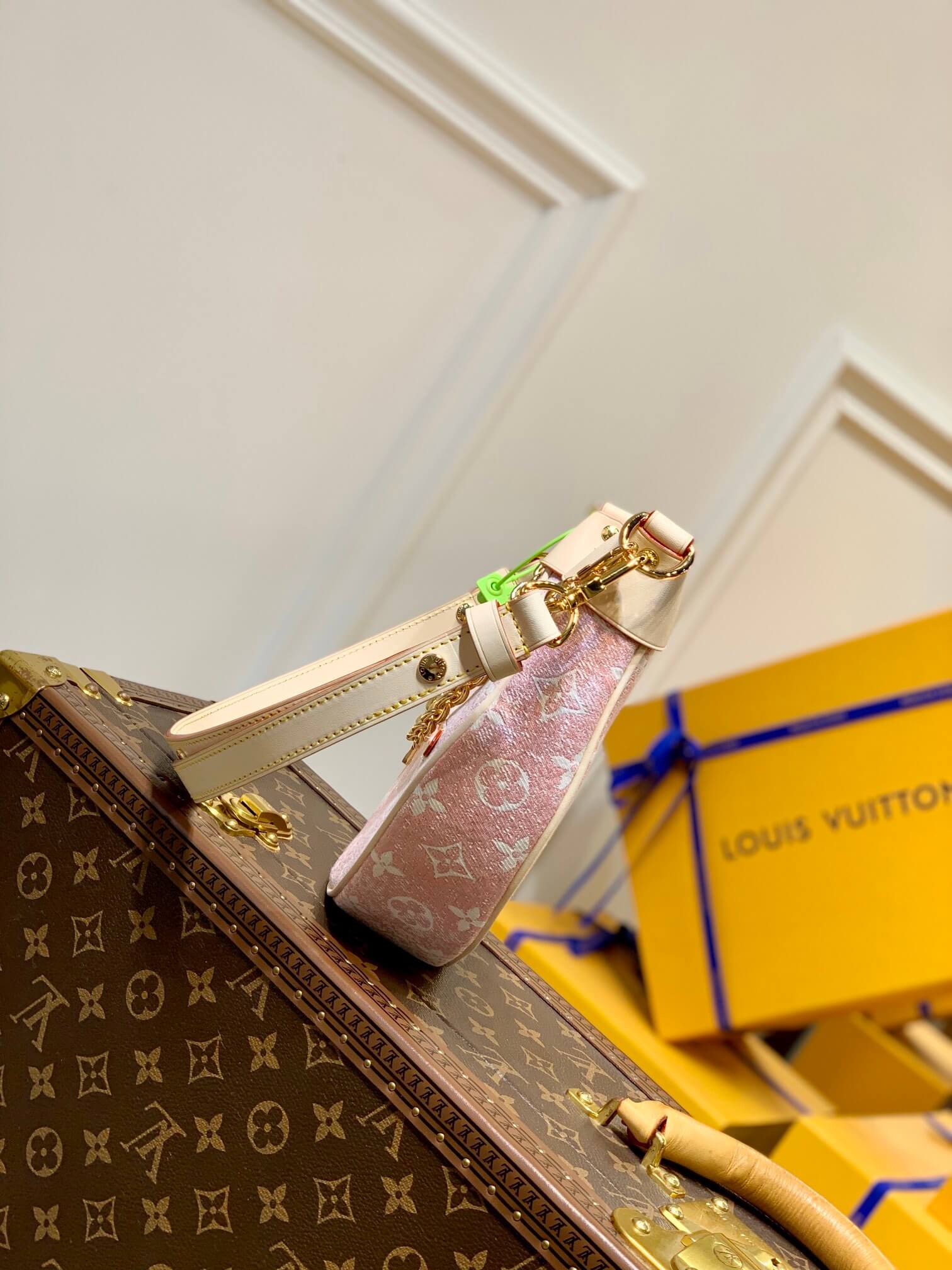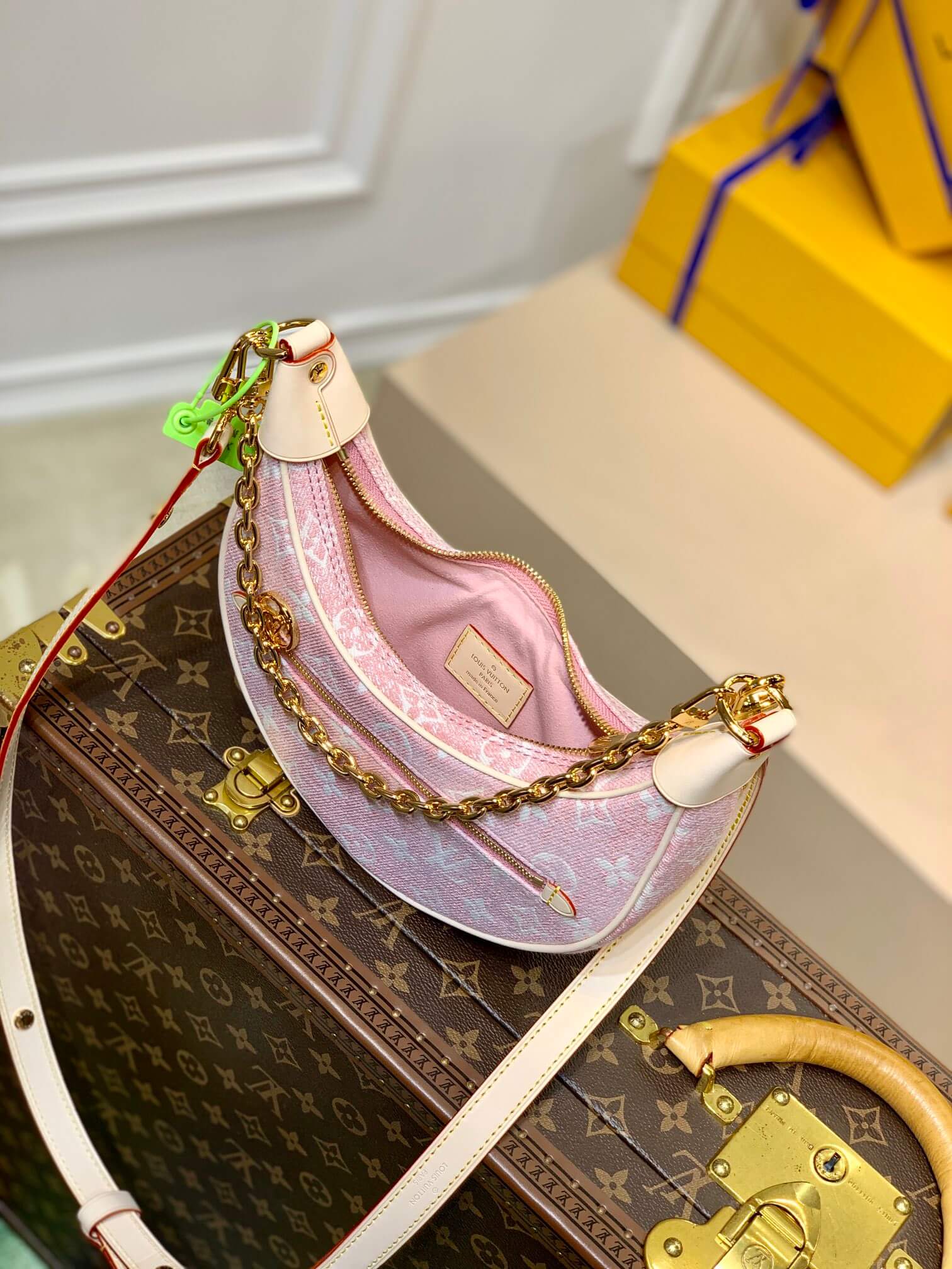 The loop half moon shaped baguette made its debut at the 2022 cruise early spring show. It was made of faded denim to set off the monogram jacquard weave, and matched with leather trim and shoulder straps. LV circle zipper head and detachable chain highlight the details.