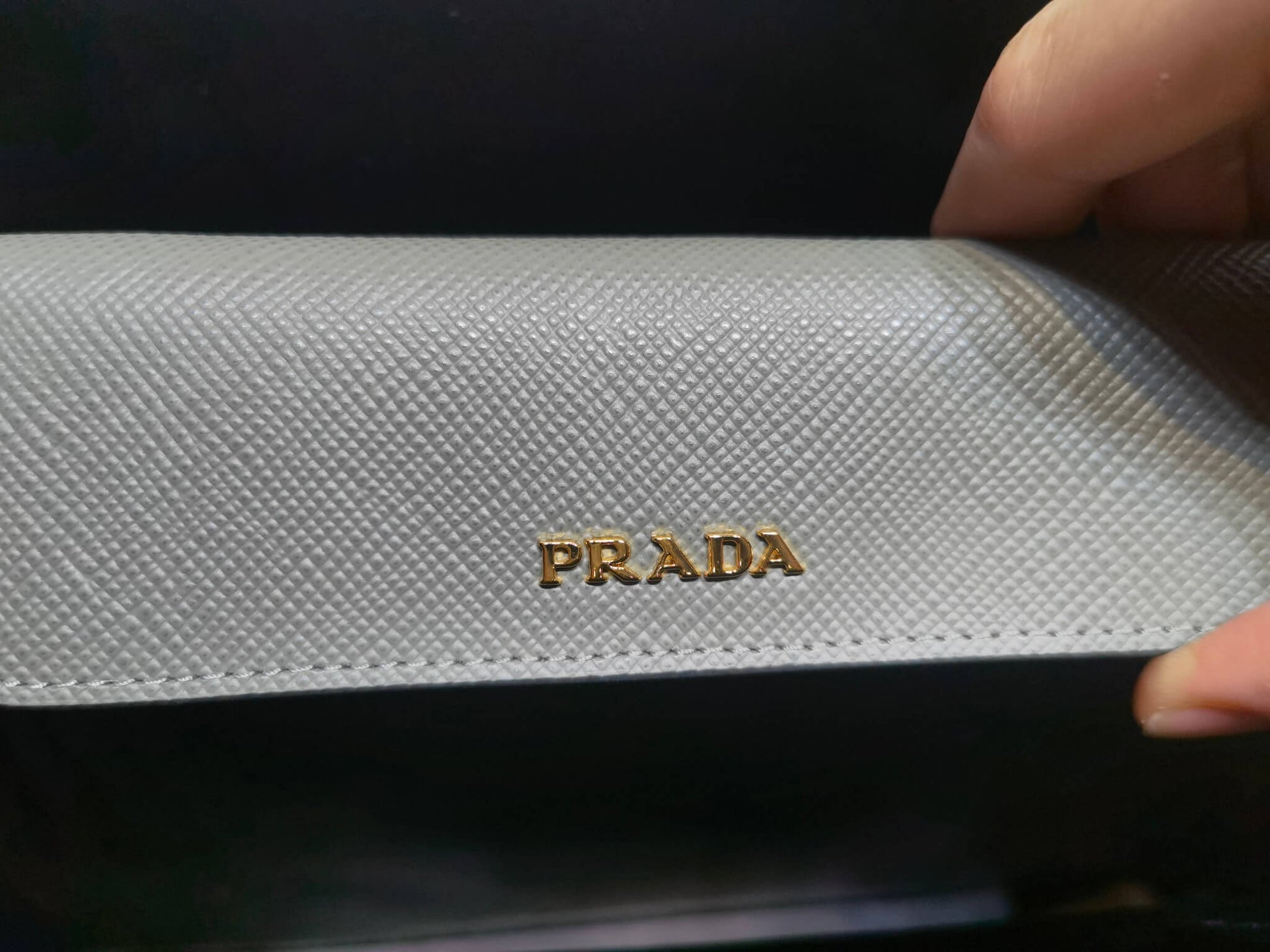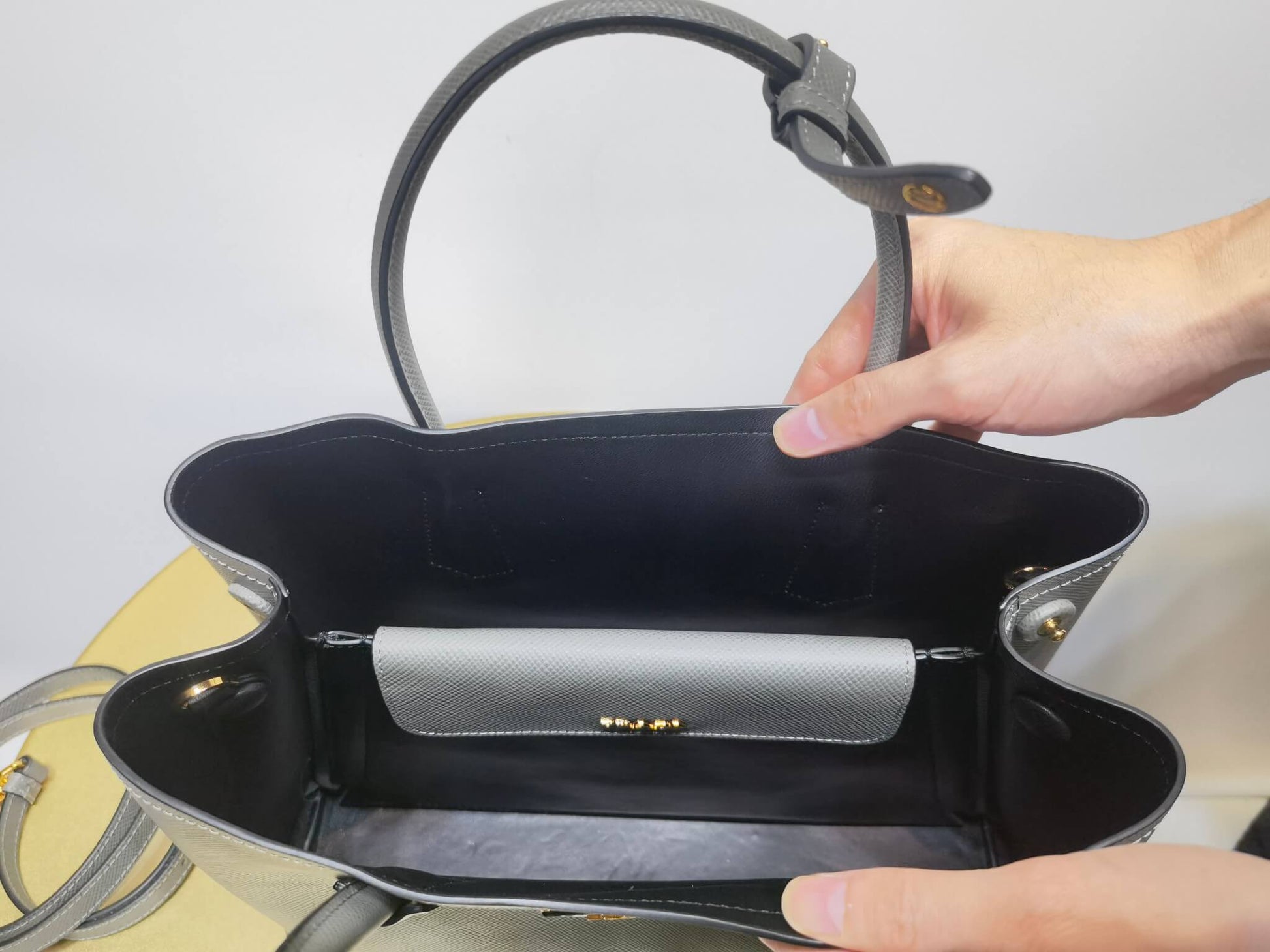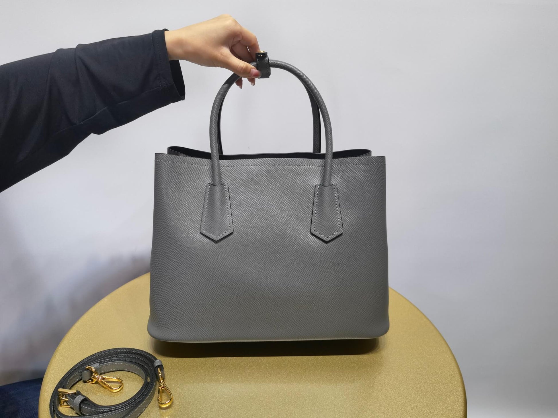 pra 1bg775 handbag double saffiano 33cm grey lambskin equipped with double handles detachable shoulder straps and soft sheepskin lining paired with gold accents