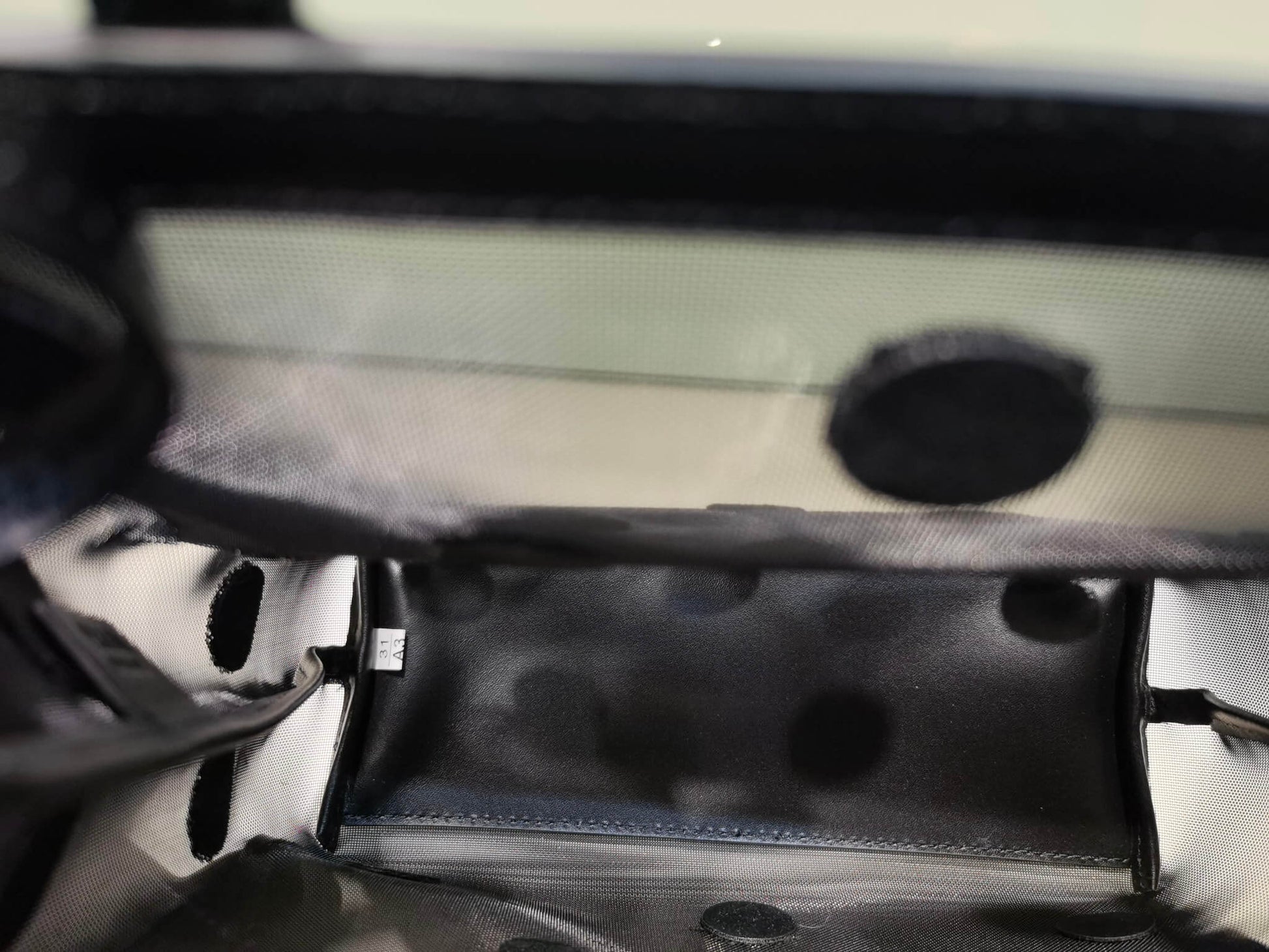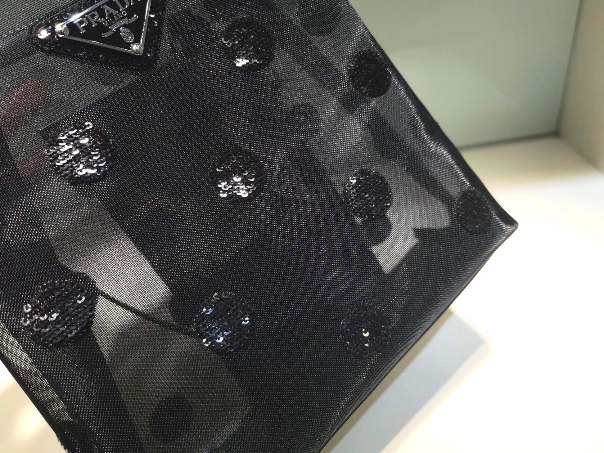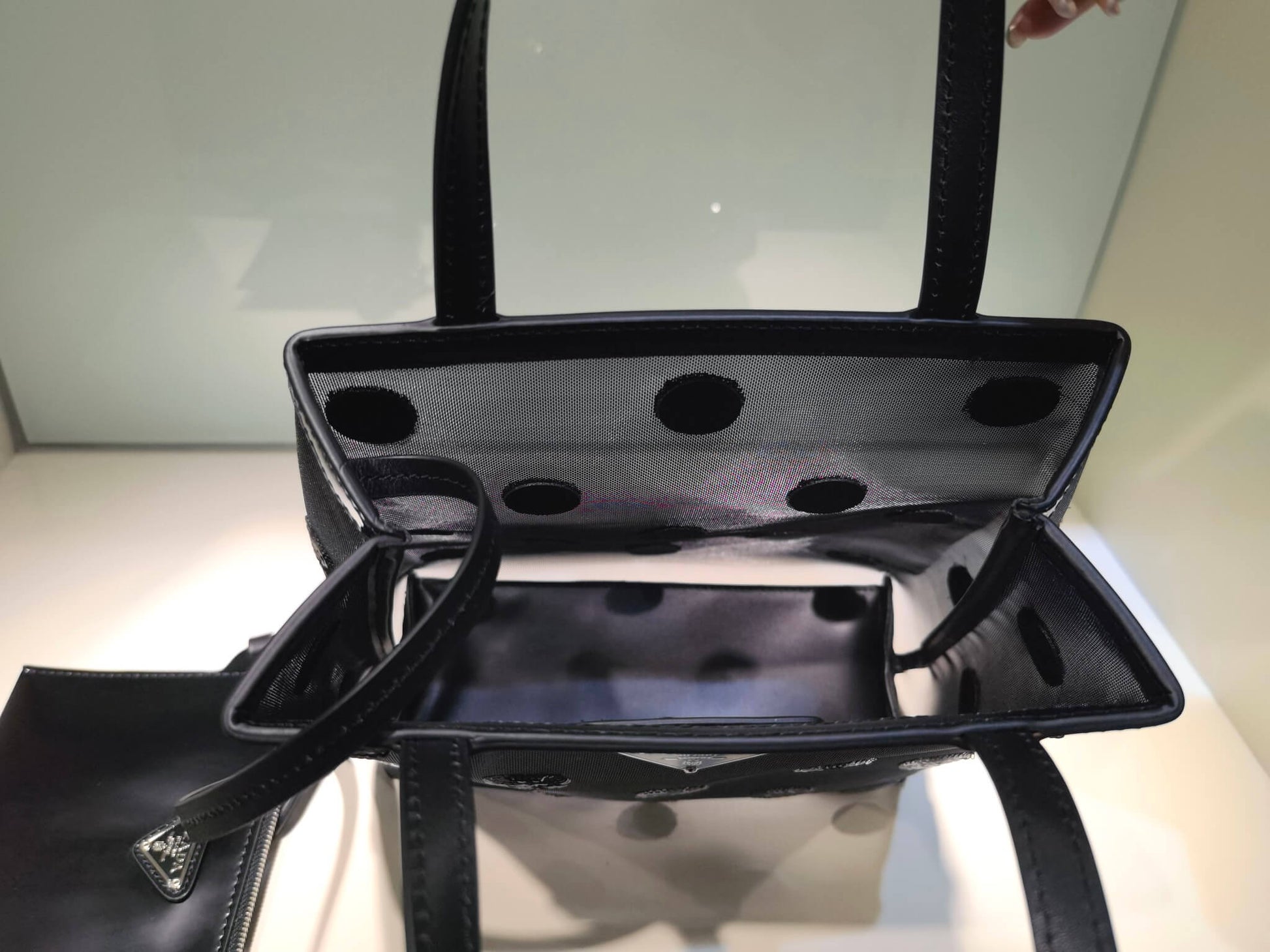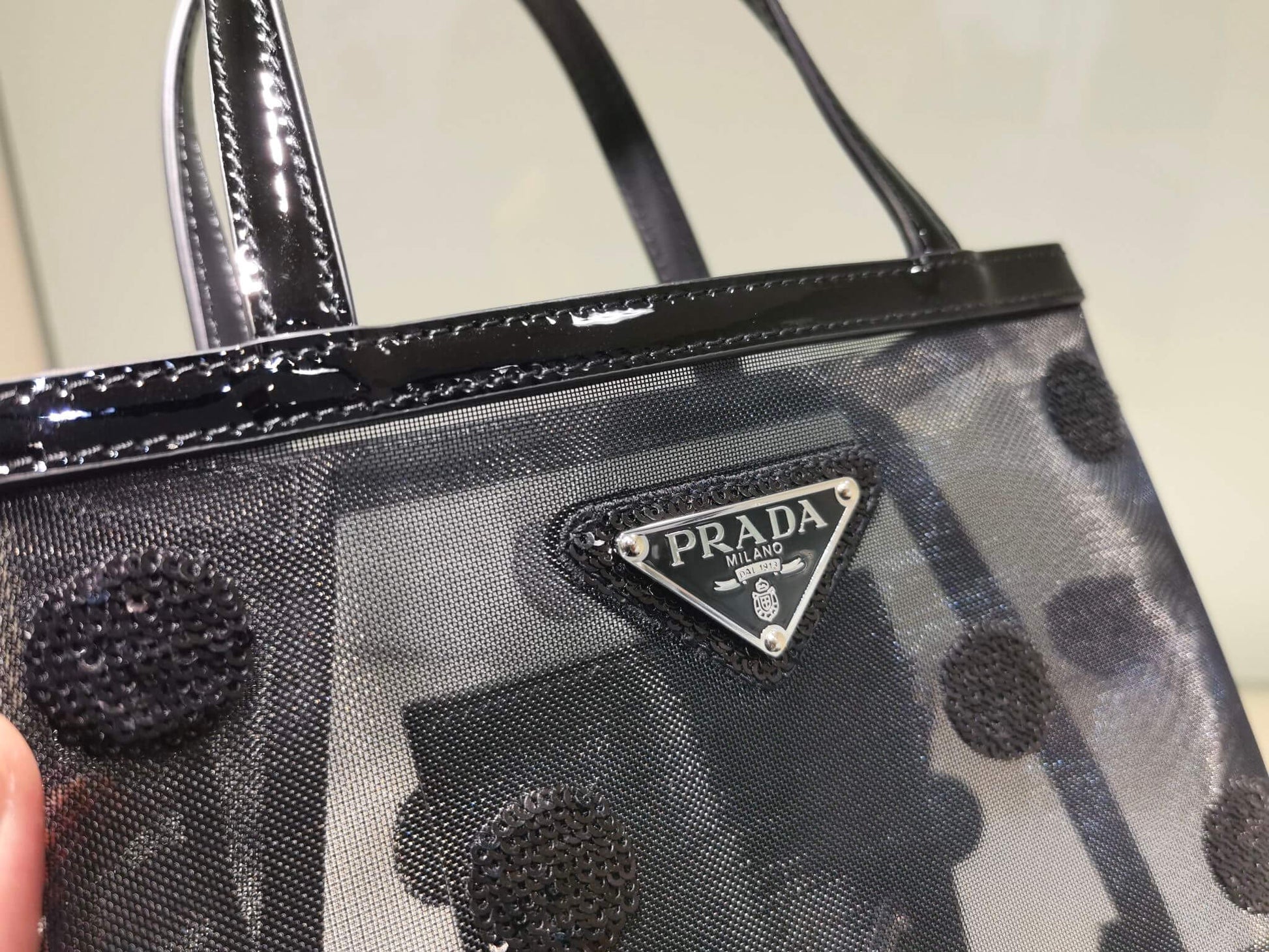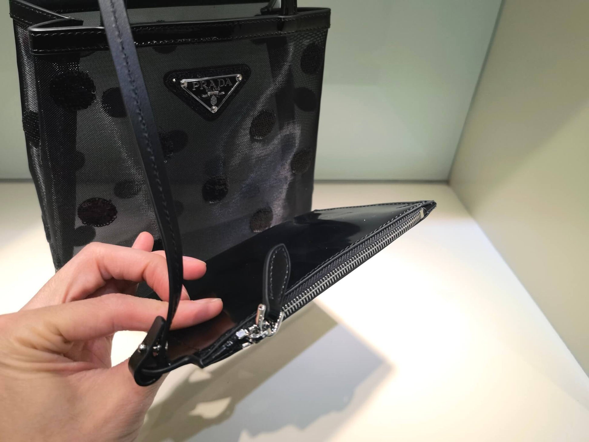 inside and is decorated with Prada's iconic enameled metal triangle logo.