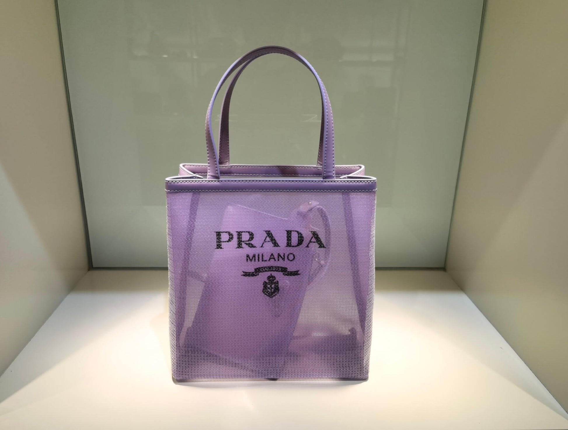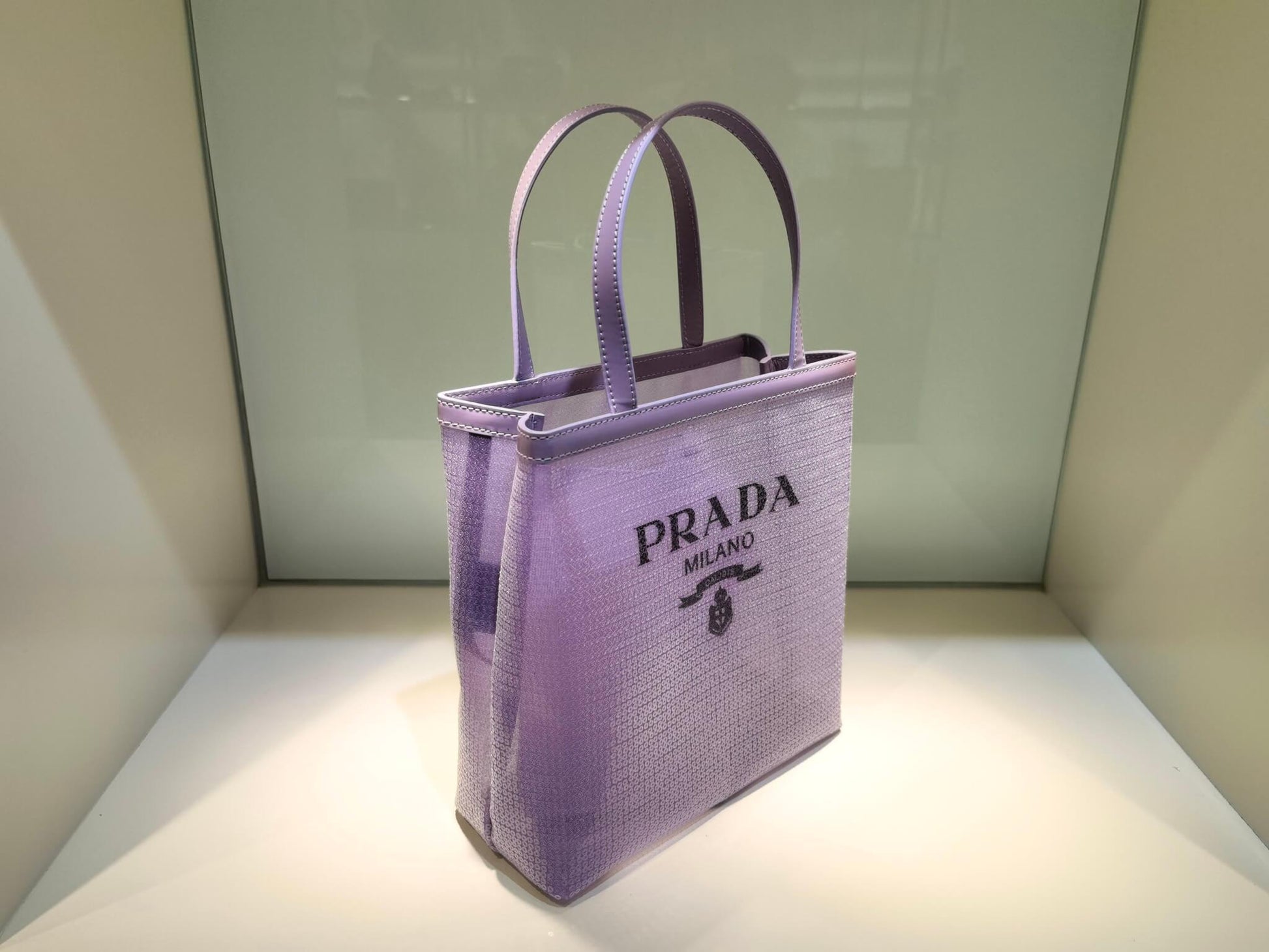 inside and is decorated with Prada's iconic enameled metal triangle logo.