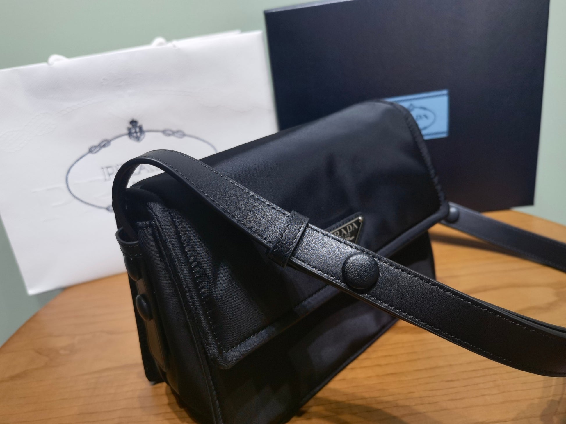 Crafted with innovative Prada Re Nylon recycled nylon. Re Nylon recycled nylon fabric is made from recycled marine plastics. Enamel coated metal triangle logo. There is a zippered pocket inside.
