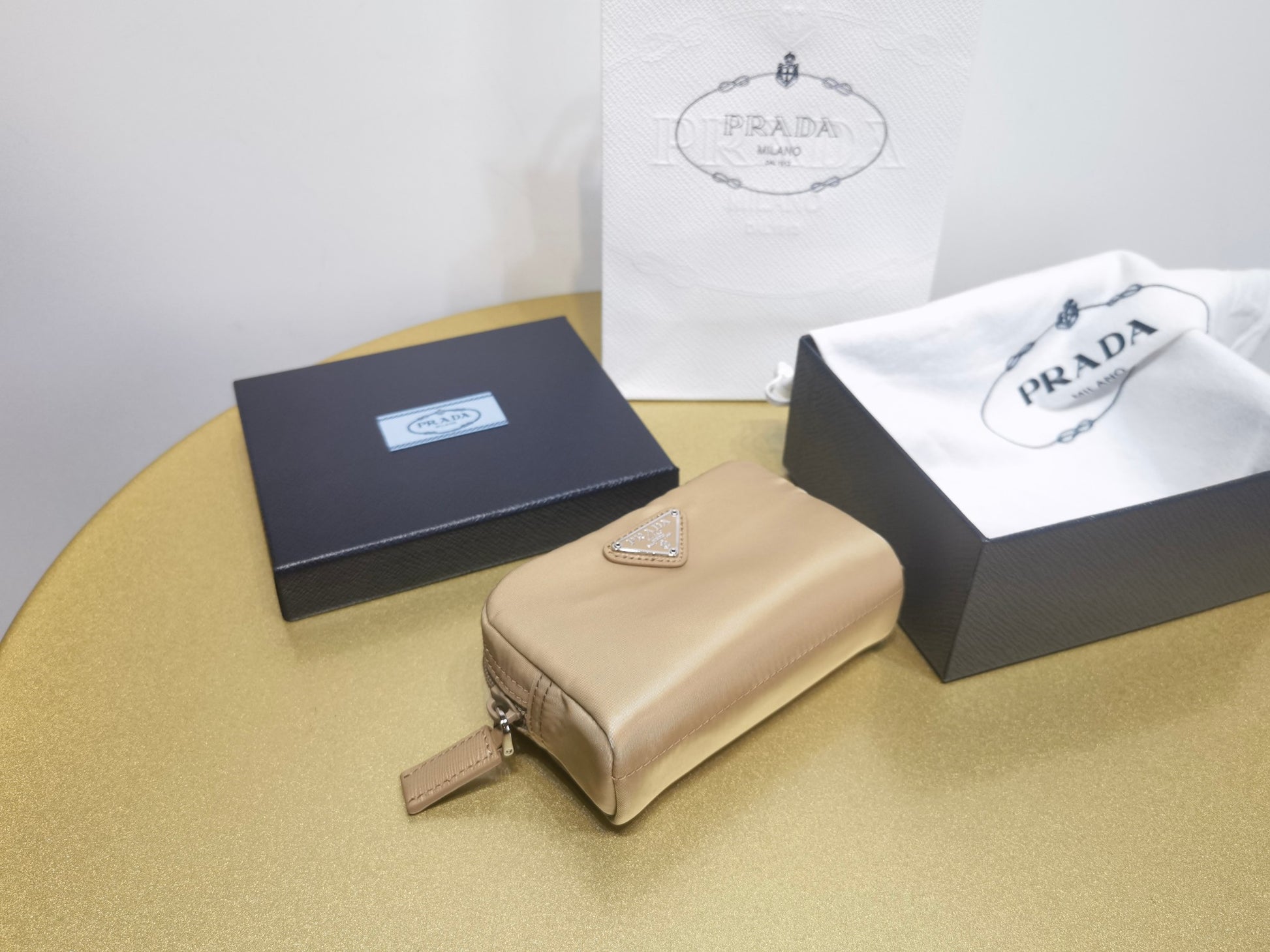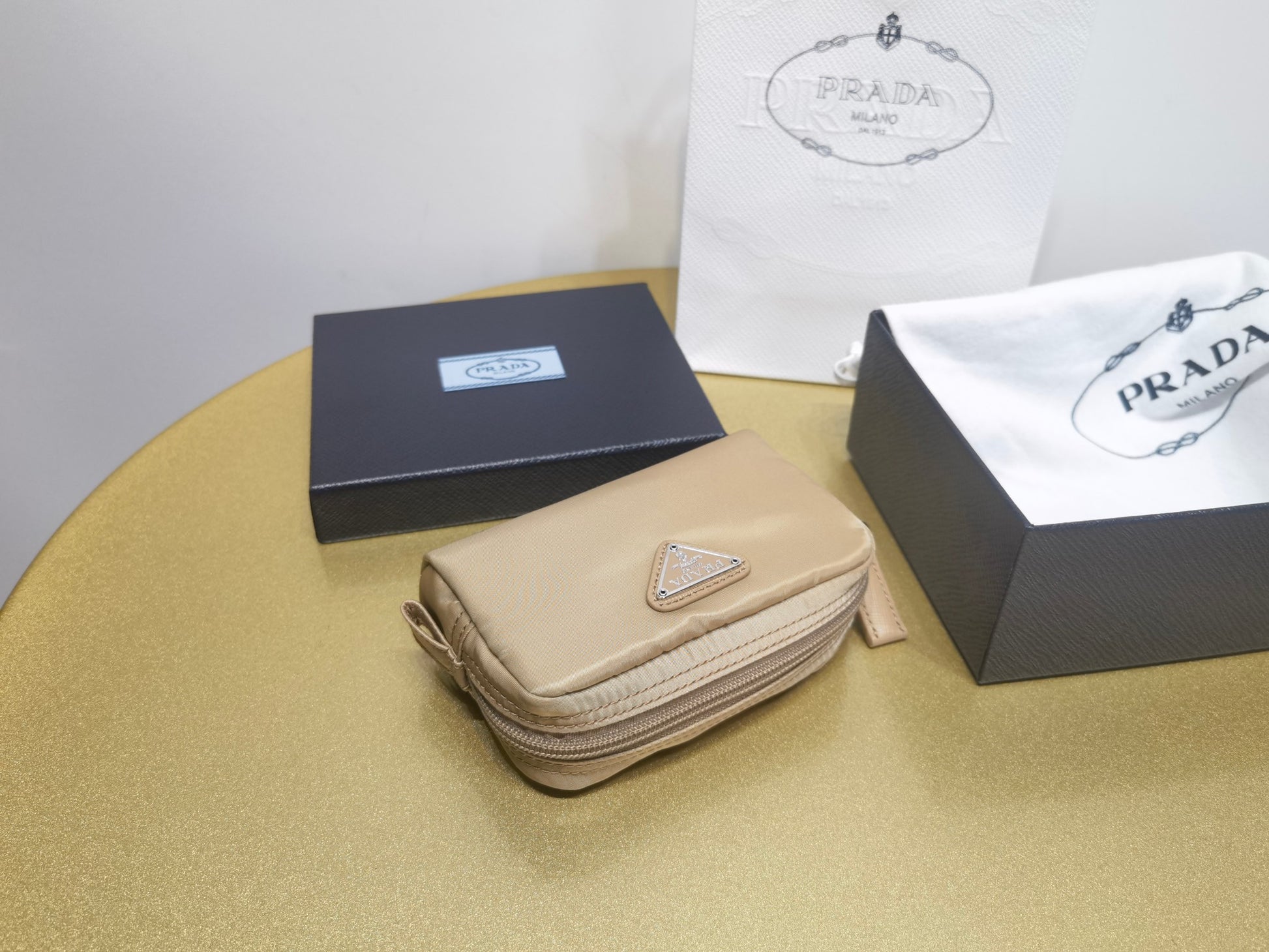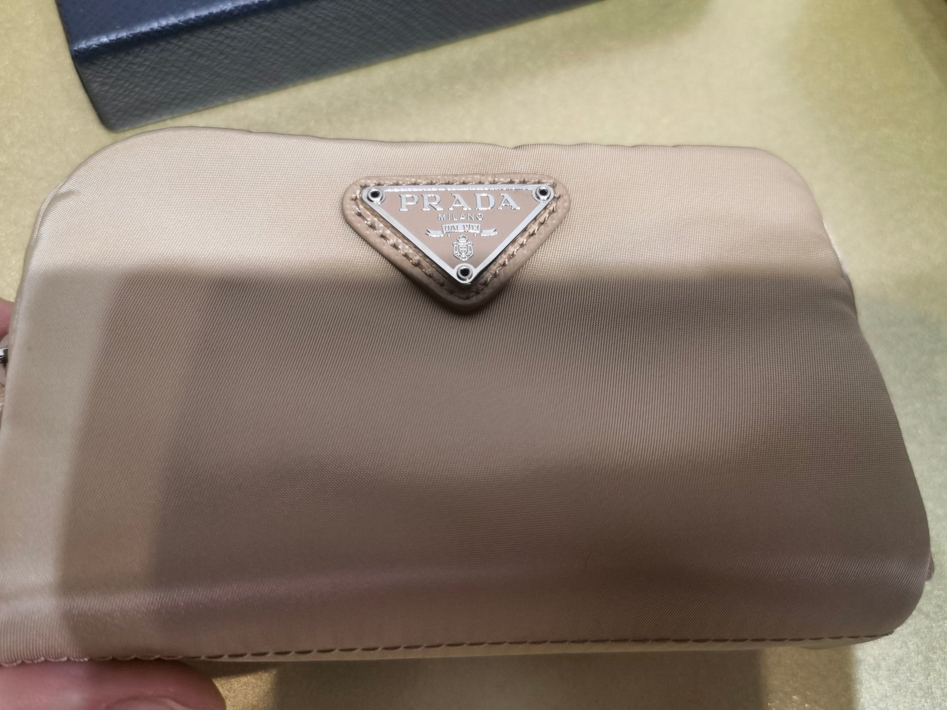 Crafted with innovative Prada Re Nylon recycled nylon. Re Nylon recycled nylon fabric is made from recycled marine plastics. Enamel coated metal triangle logo. There is a zippered pocket inside.