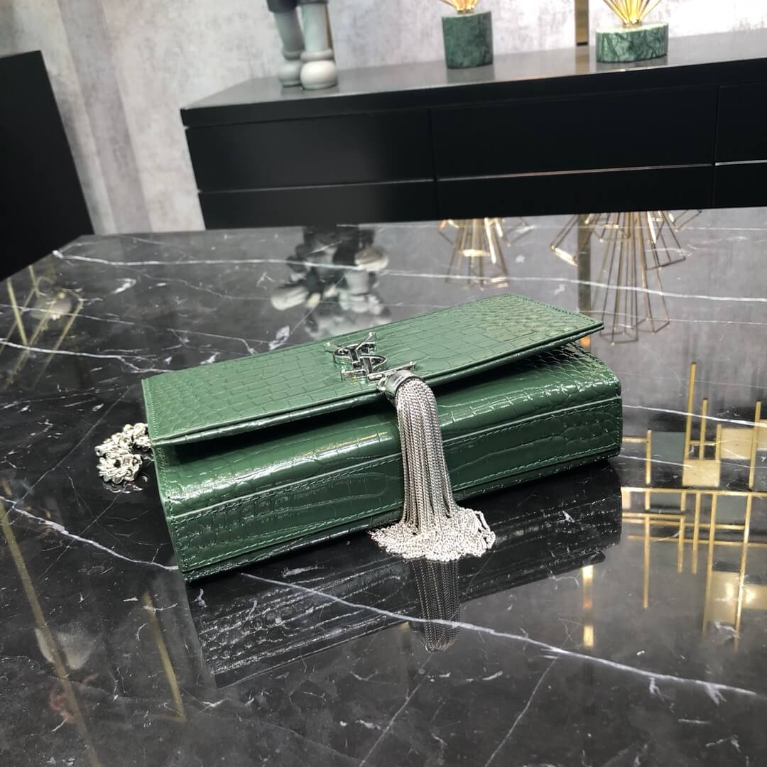 Kate small shiny crocodile texture embossed leather chain tassel bag ,Monogram Saint Laurent bag, decorated with horsestring chain, YSL letter connection metal ornaments and metal tassels.