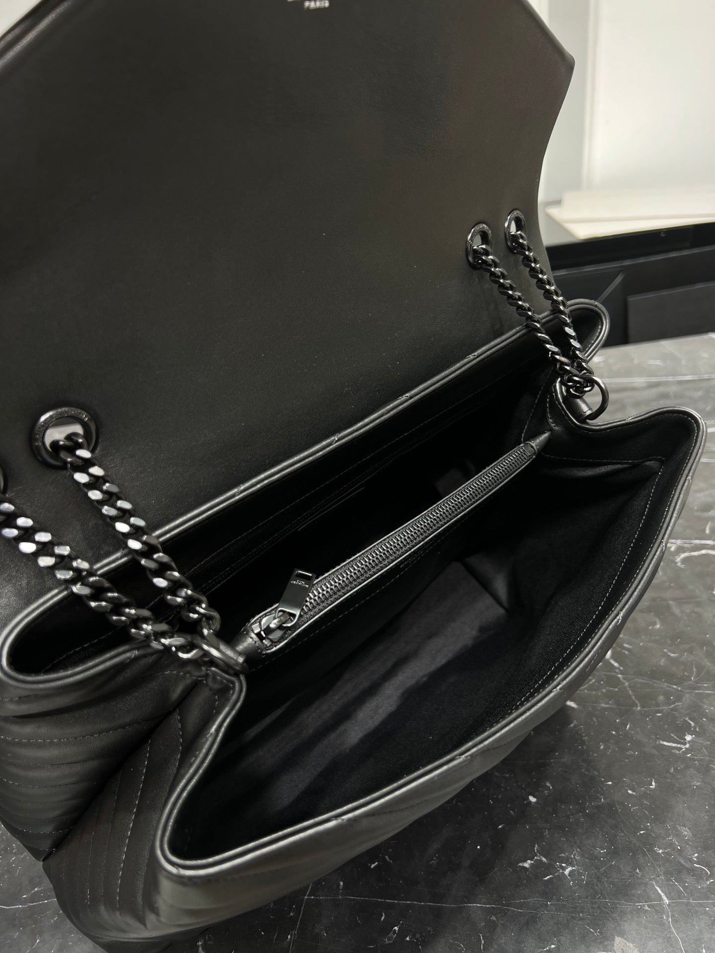 With metal connection, metal logo, metal and leather chain shoulder strap and "Y" stitching