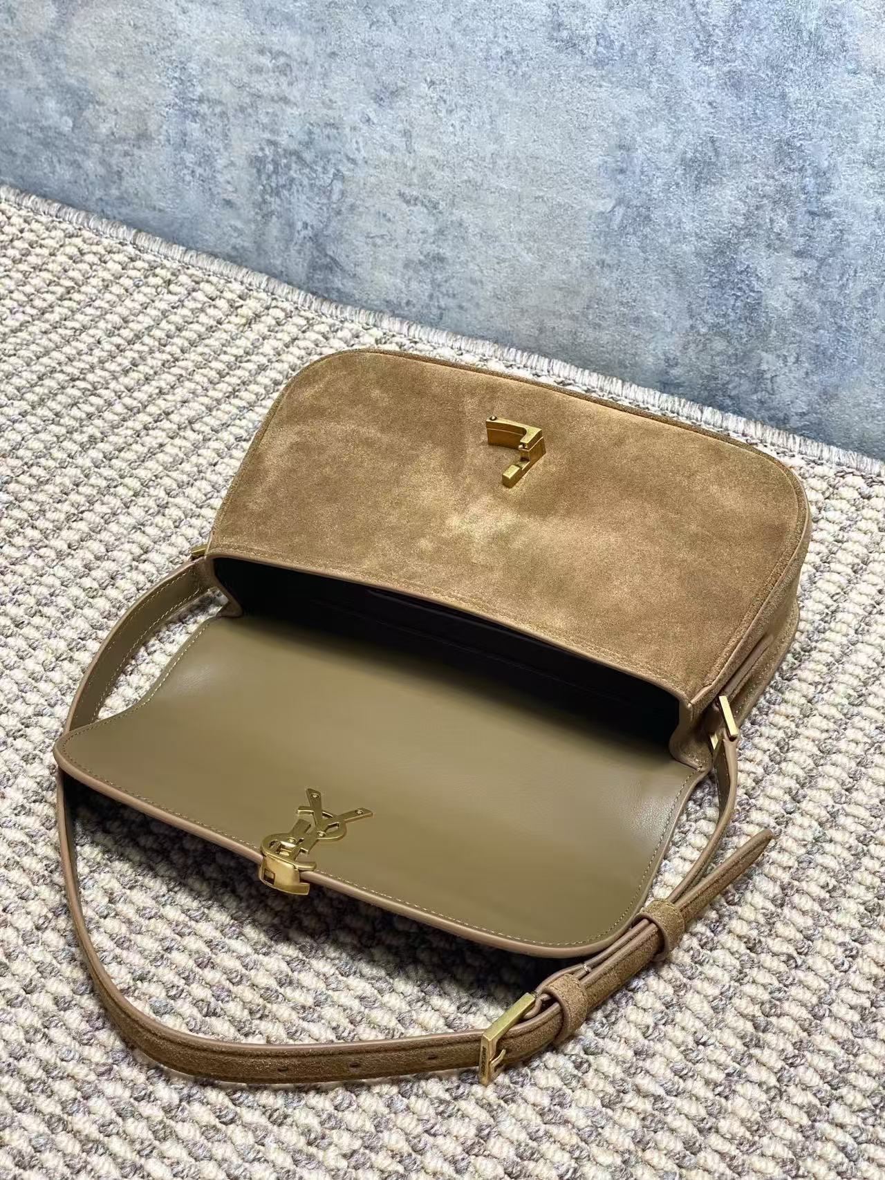 The YSL Solferino matte finish underarm bag is crafted from soft suede, featuring a caramel brown hue paired with a metallic YSL clasp, exuding a vintage elegance. With dimensions of 24.5x15x8.5cm, the adjustable shoulder strap allows for comfortable carrying whether worn over the shoulder or across the body, making it ideal for both commuting and dating. The sheepskin lining provides a delicate texture, while the sleek lines are more subdued than the original version. It pairs perfectly with sweaters and coats in autumn and winter, offering both practicality and fashionability. This classic YSL model is a popular choice!